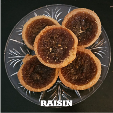 A buttery pressed pastry shell filled with smooth brown sugar and sweet, plump raisins baked to perfection for a classic butter tart experience.